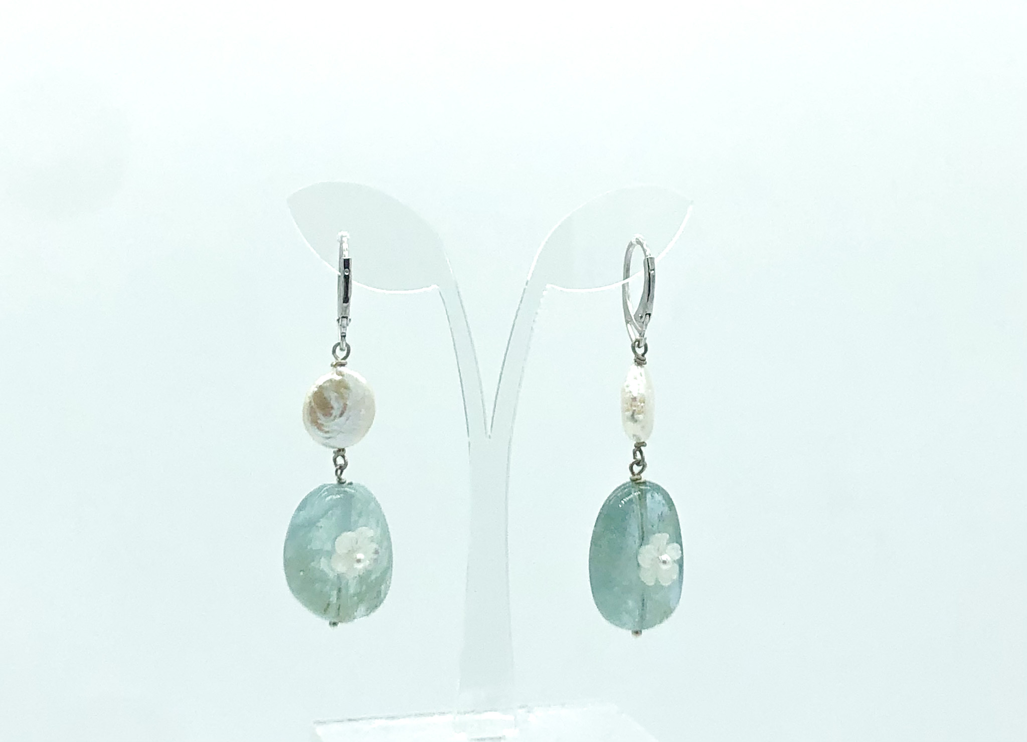 Orecchini in acquamarina, perle e fiore in madreperla montati in argento anallergico