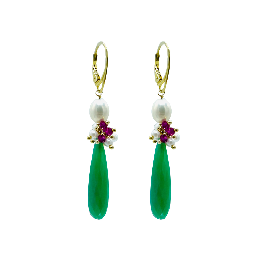Orecchini con calcedonio, perle e zirconi montati in argento dorato anallergico