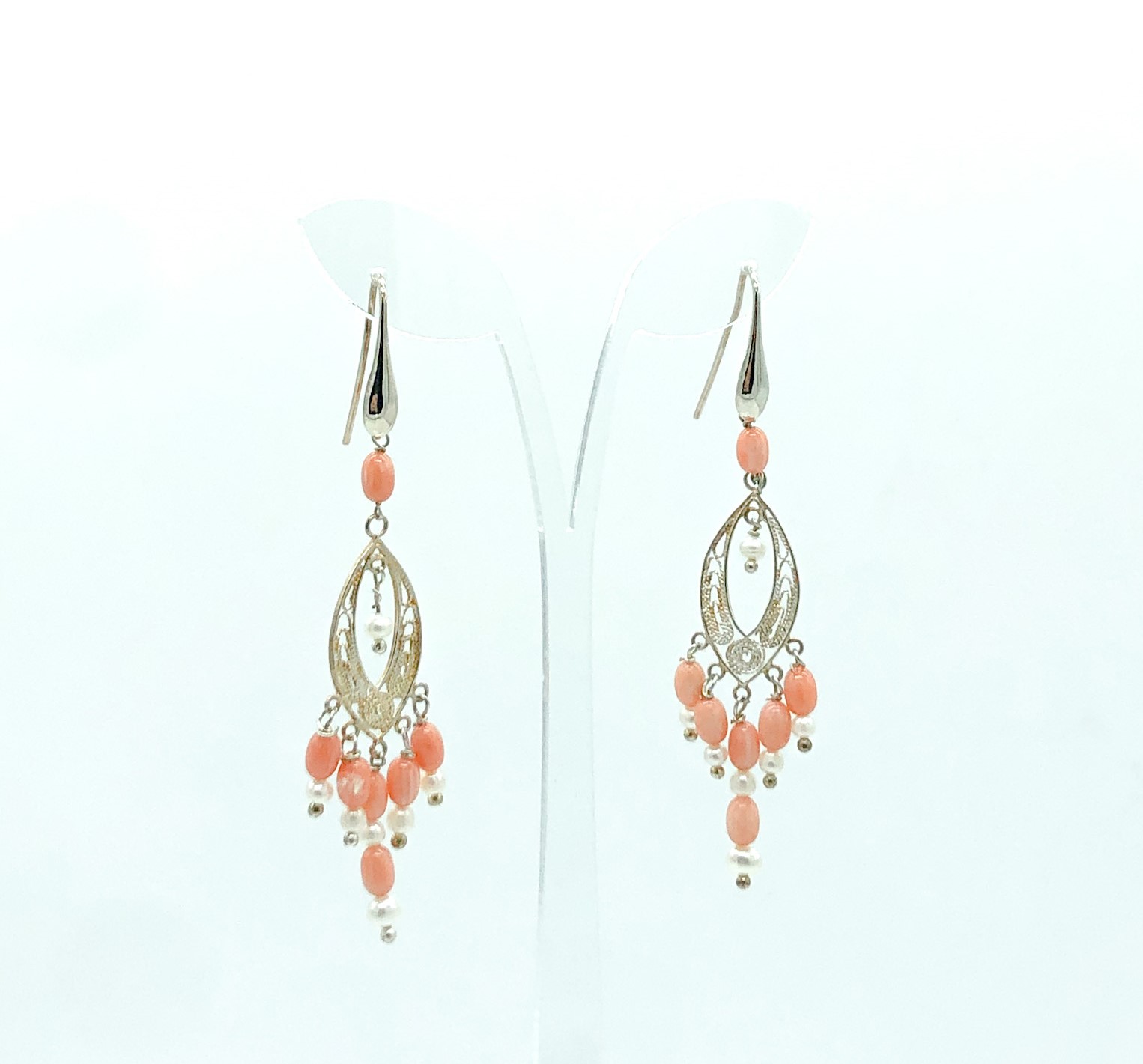 Orecchini in corallo e perle montati in argento bianco anallergico